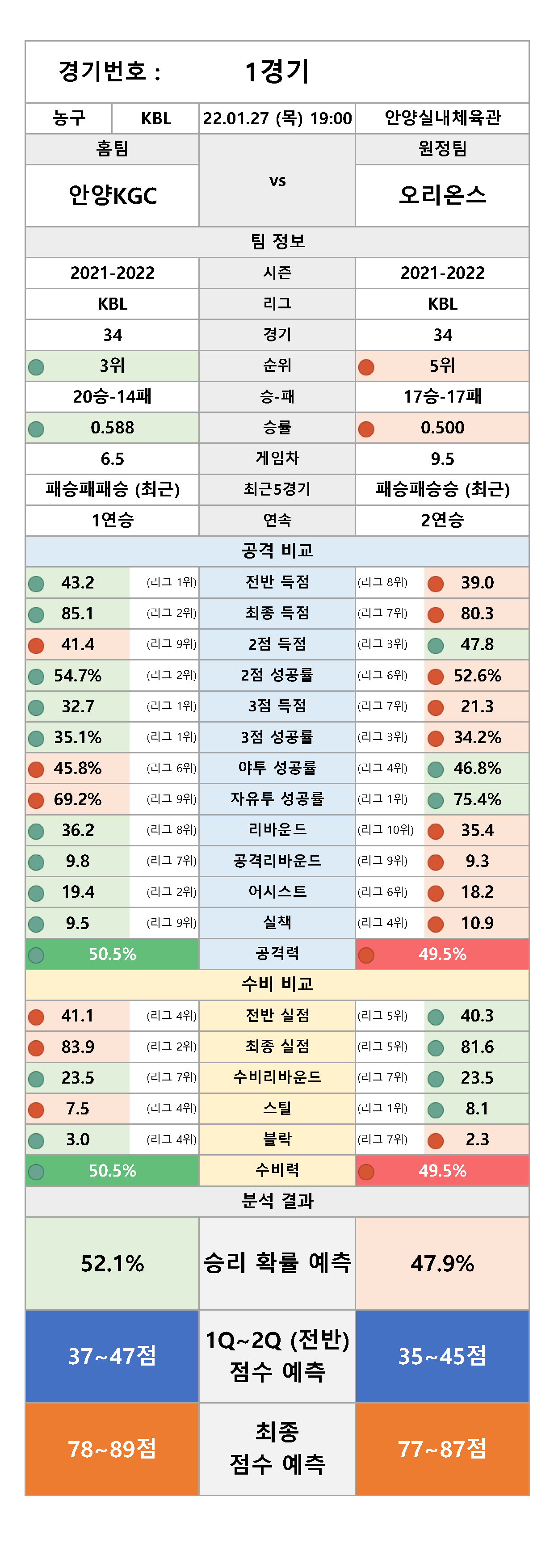 해당 팀에 대한 현재 성적을 확인해 보시고, 예측 결과도 참고하시기 바랍니다.