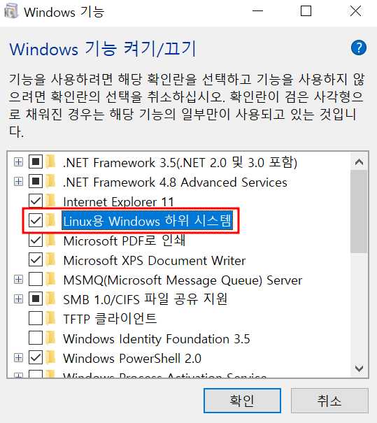 Windows 기능이라는 팝업창이 나타나면, 'Linux용 Windows 하위 시스템'이 보이게되고 위 그림과 같이 선택을 해주세요.
