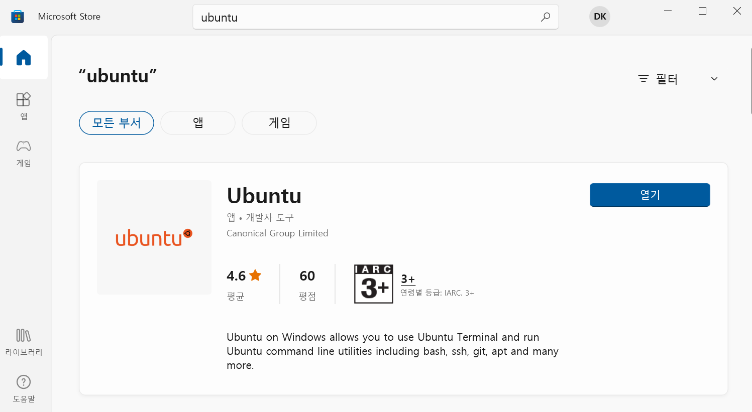 Microsoft Store 검색창에 ubuntu를 입력하시면 위 그림과 같이 ubuntu를 설치할 수 있습니다.