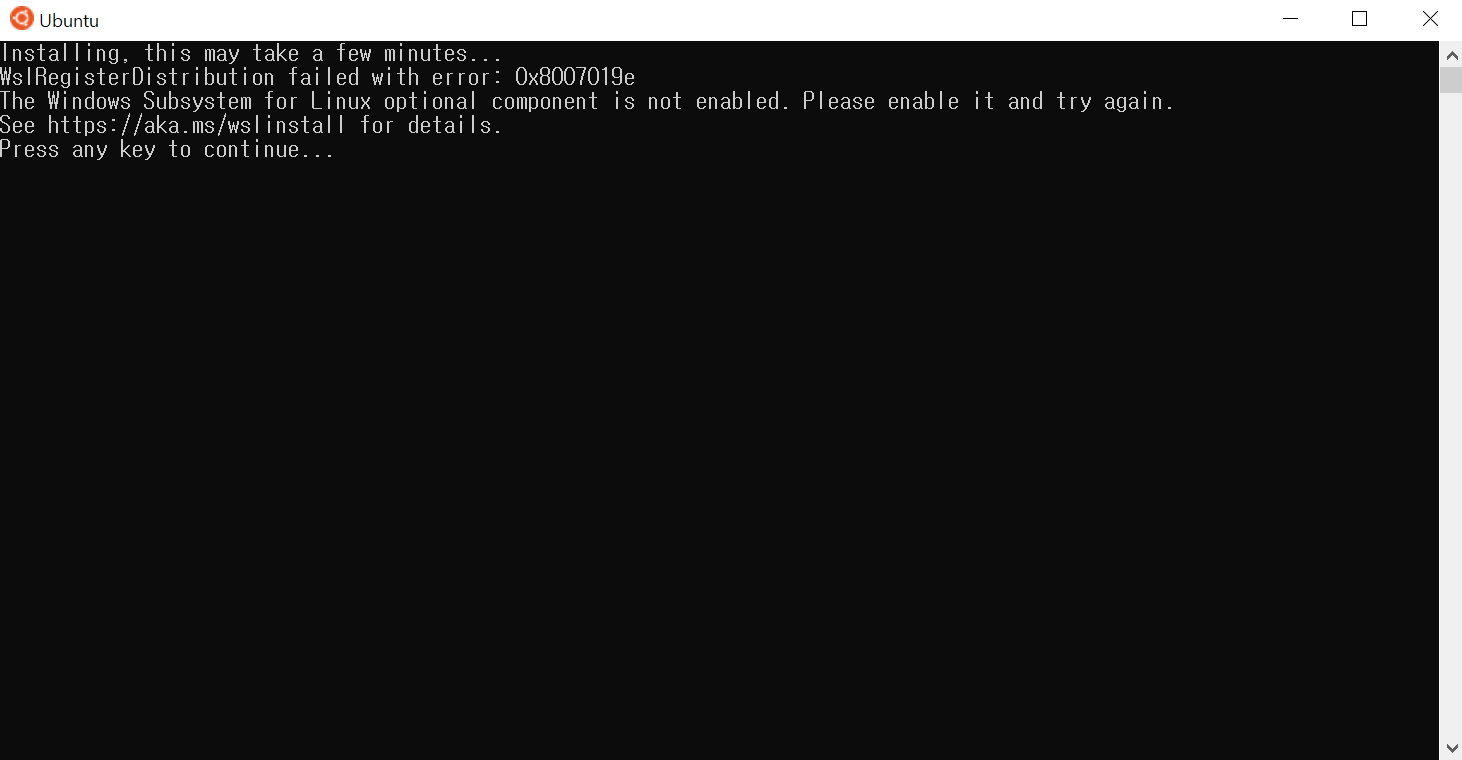 The Windows Subsystem for Linux optional component is not enabled. Please enable it and try again.