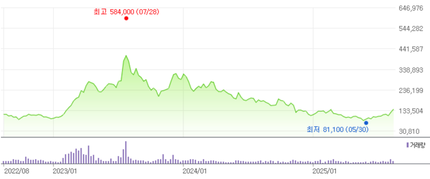 - 2023년 7월 고점 (584,000원): 이 시기는 전기차 시장의 폭발적 성장에 대한 기대감과 개인 투자자들의 열풍이 결합되어 만들어낸 '광기'의 정점이었다. 미래의 모든 긍정적 시나리오가 주가에 선반영되었다.